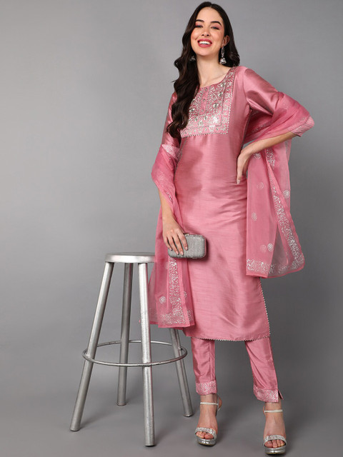 Specification: AHIKA Women Pink Floral Embroidered High Slit Kurti with Trousers & With Dupatta