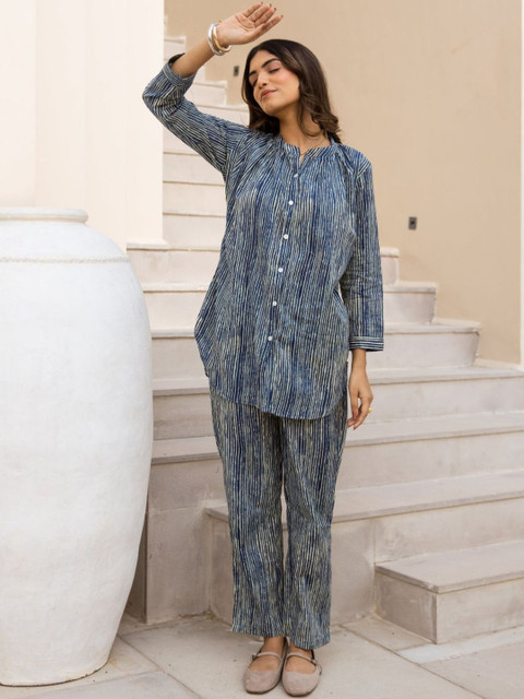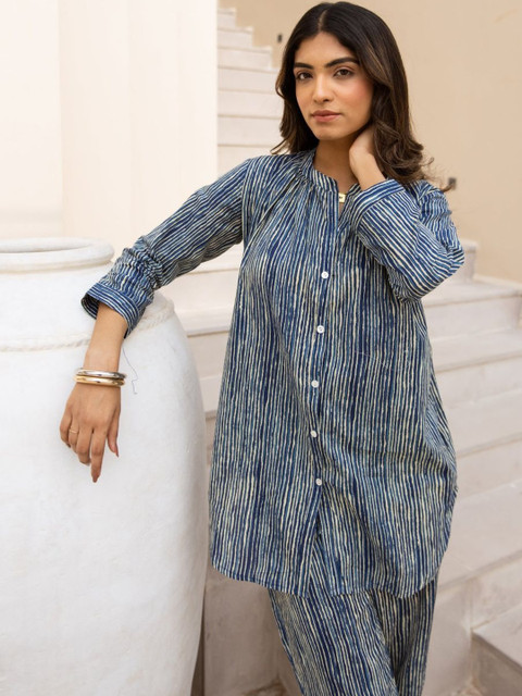 Blue striped tunic has mandarin collar & three quarter sleeves with slip on closure