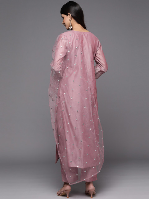 • At myntra.com you can purchase Varanga Women Mauve Floral Yoke Design Chanderi Silk Kurta with Trousers & With Dupatta for only ₹ 1,379
