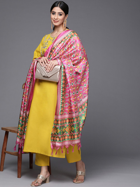 - At myntra.com you can purchase Varanga Women Mustard Yellow Yoke Design Mirror Work Cotton Kurta with Trousers & Dupatta for only ₹ 1,699